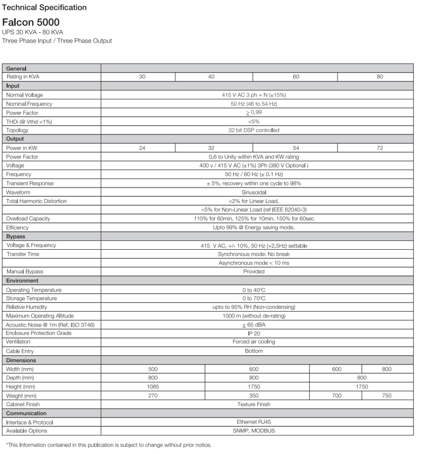 The Falcon UPS 30 KVA – 80 KVA offers reliable and scalable power protection for critical applications in various industries. With its high power capacity, online double conversion technology, advanced battery management, and comprehensive monitoring features, it ensures continuous operation of mission-critical equipment, minimizes downtime, and protects against power disturbances, safeguarding business continuity and operational efficiency.